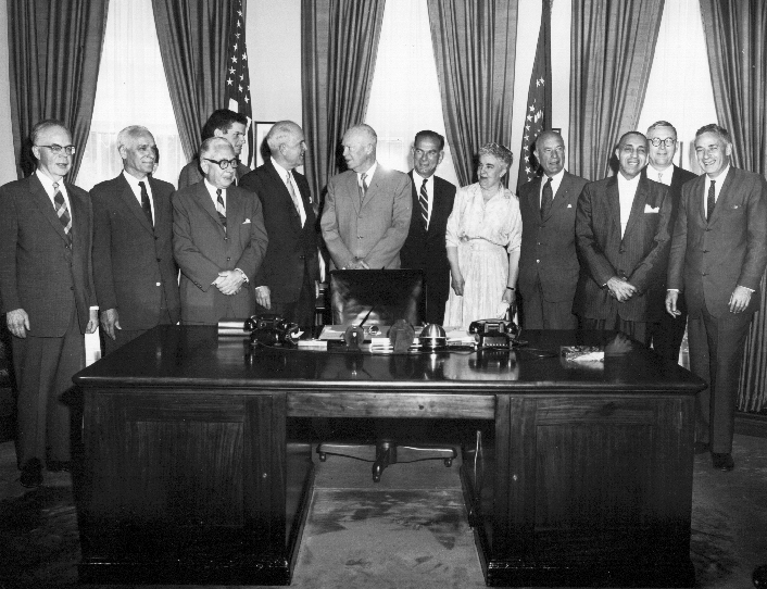 Members of the Board of Foreign Scholarships call on President Dwight D. Eisenhower at the White House on June 15, 1959. Left to right: Dr. Elmer Ellis, president, University of Missouri; Dr. John N. Andrews, Veterans Administration; Dr. Hurst Robins Anderson, president, American University; Daniel W. Hofgren, student, Columbia University; Dr. Robert G. Storey, dean, Law School, Southern Methodist University; President Eisenhower; Senator Fulbright; Bernice B. Cronkhite, dean, Graduate School, Radcliffe College; Robert H. Thayer, special assistant to the Secretary for the Coordination of International Educational and Cultural Relations; Felton G. Clark, president, Southern University; Dr. John Orth Riedl, dean, Graduate School, Marquette University; and Dr. George C. S. Benson, president, Claremont Men's College.